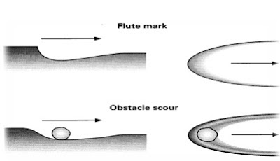 · Huellas de cristales: En Sobre un fondo más o menos arcilloso pueden precipitar cristales de yeso o halita que, al disolverse, dejan un hueco que en un medio sedimentario de baja energía pueden rellenarse de un sedimento fino, obteniéndose un calco de la forma cristalina